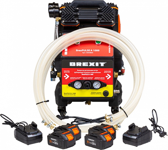 Аккумуляторный компрессор для промывки системы отопления Brexit BrexPulse A1000 (Брекзит БрекзПульс А1000) предназначен для эффективной промывки трубопроводов многоквартирных домов, питьевых и отопительных водопроводов, систем обогрева пола, радиаторов, дезинфекции систем питьевого водоснабжения (реализация данной функции требует применения редуктора и инжектора, поставляемых отдельно), защиты от налета и коррозии.