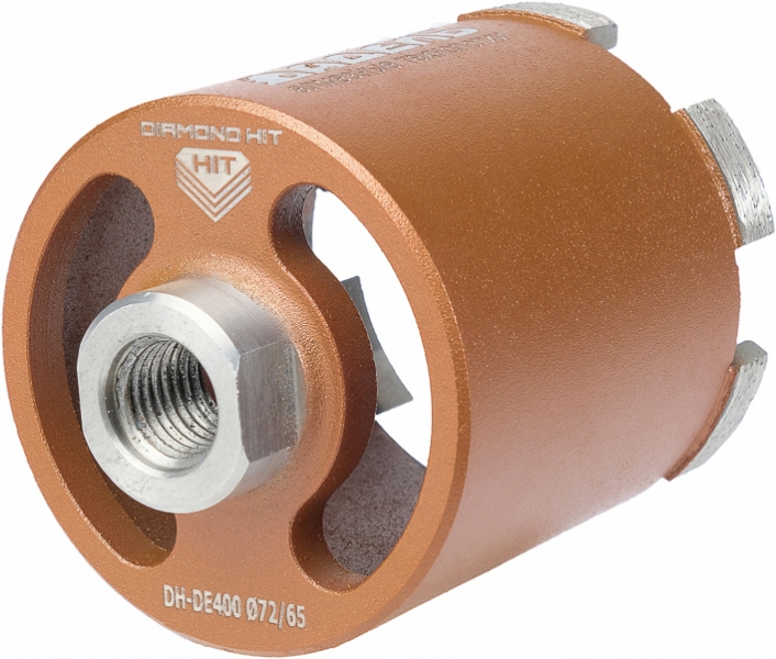 НОУ-ХАУ в сухом алмазном сверлении железобетона – новейшая передовая технология Diamond Hit !!! Алмазная коронка с пылеудалением для сухого сверления подрозетников с микроударом Адель Diamond Hit DH-DE400 72/65 мм (Adel Даймонд Хит ДХ-ДЕ400 72/65 мм) предназначена для сухого алмазного бурения бетона, железобетона с любой степенью армирования, кирпича, для монтажа подрозетников с использованием дрелей алмазного бурения с функцией микроудара.