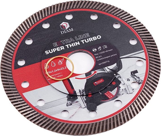 Алмазный диск Diam Extra Line Turbo Super Thin 125 мм (Диам Экстра Лайн Турбо Супер Тин 125 мм) – специальный алмазный круг для сухой и мокрой резки керамики (керамической глазурованной плитки), керамогранита, мрамора, кварца, на ручном электроинструменте и системах раскроя крупного формата.