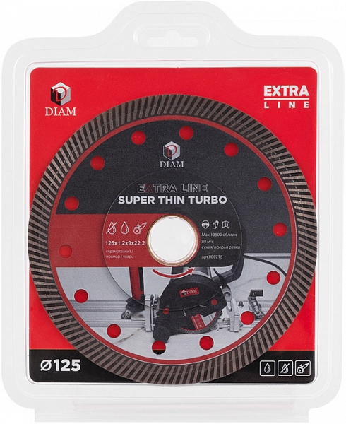 Цена и технические характеристики алмазного диска Diam Extra Line Turbo Super Thin 125 мм: