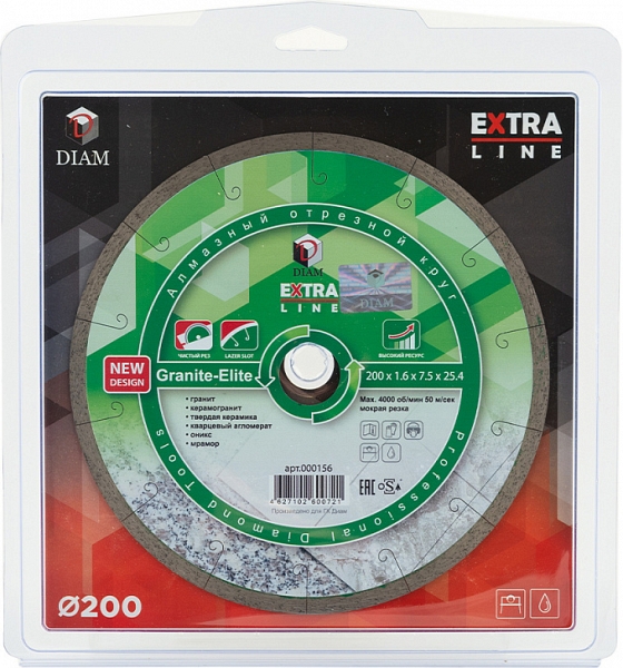 Алмазный отрезной круг Diam Extra Line 1A1R Корона Granite-Elite 200 мм (Диам Экстра Лайн 1А1Р Корона Гранит-Элит 200 мм) – премиальный алмазный диск для мокрой резки гранита, керамогранита, твердой керамики, кварцевого агломерата, оникса, мрамора, габбро, лабрадорита, базальта и других пород твердого натурального камня на болгарках (ушм), штроборезах и плиткорезах электрических с подачей воды. За долгое время зарекомендовал себя с отличной стороны у многих мастеров, как инструмент, обеспечивающий очень качественное выполнение задач практически по всем твердым материалам, при этом имеет очень большой ресурс и скорость работы.