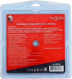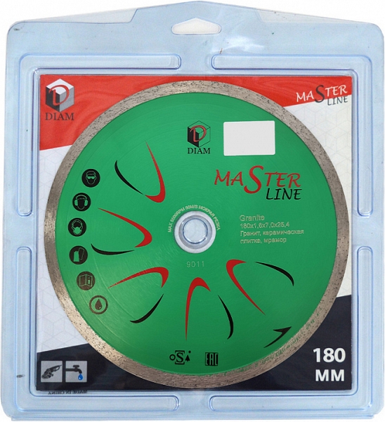 Алмазный отрезной круг Diam Master Line 1A1R Корона Granite 180 мм (Диам Мастер Лайн 1А1Р Корона Гранит 180 мм) – универсальный недорогой алмазный диск высокого качества со сплошной режущей кромкой для резки гранитной, мраморной и керамической плитки болгарками (ушм), штроборезами и плиткорезами электрическими с подачей воды.