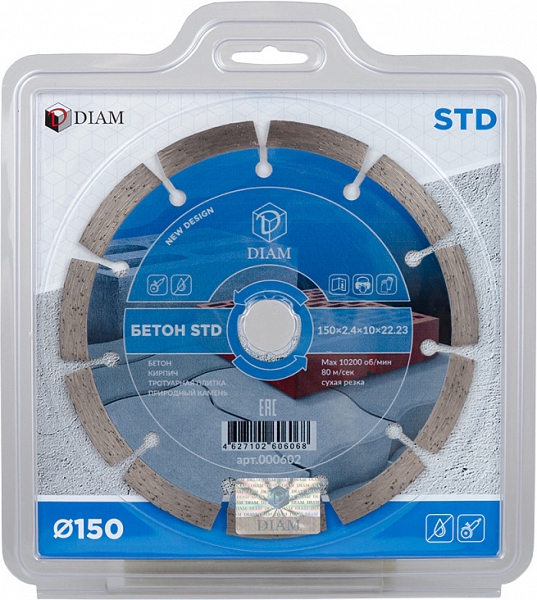Алмазный отрезной круг Diam STD 1A1RSS Бетон 150 мм (Диам СТД 1А1РСС Бетон 150 мм) – сегментный алмазный диск для сухой резки бетона, кирпича, тротуарной плитки, природного камня, без водяного охлаждения.