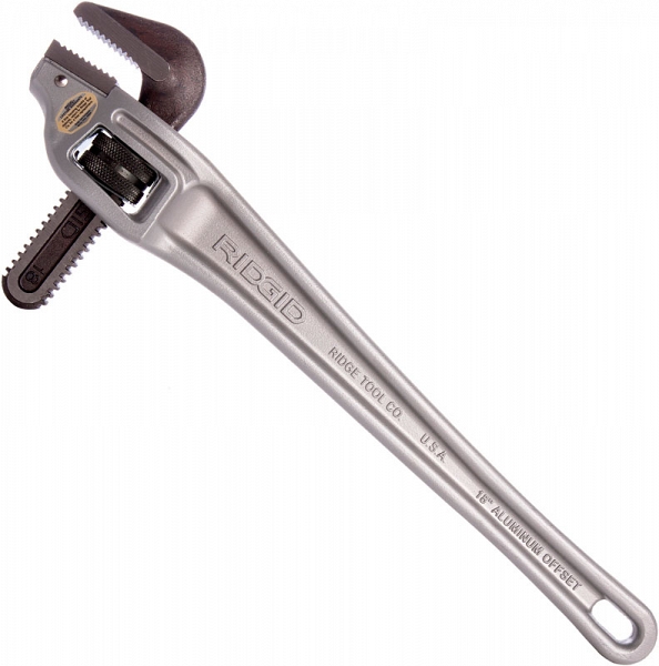 Алюминиевый коленчатый трубный ключ Ridgid Aluminum OffSet Heavy Duty 18" (Риджид Алюминум ОффСет Хэви Дьюти 18") предназначен для труб Ø до 65 мм (2 1/2"), идеально подходит для больших нагрузок и работы в труднодоступных местах.