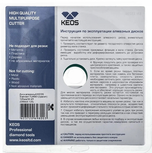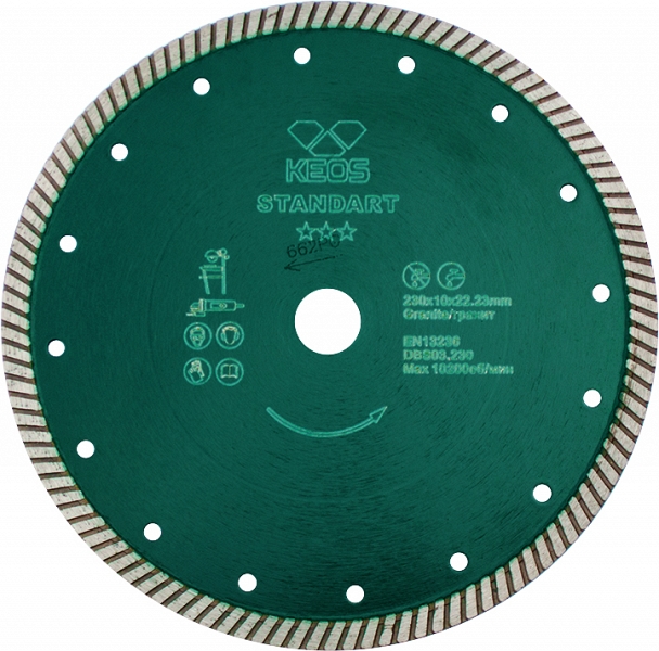 Диск алмазный по граниту Keos Standart Turbo Granite 230 мм (Кеос Стандарт Турбо Гранит 230 мм) предназначен для резки гранита, бетона, армированного бетона (железобетона), базальта, бордюрного камня, брусчатки, искусственного камня, природного камня, кирпича, клинкера, песчаника и т.д. ушм (болгарками), штроборезами, бензорезами, электрическими резчиками и плиткорезами, стенорезными машинами, как с подачей воды, так и всухую.