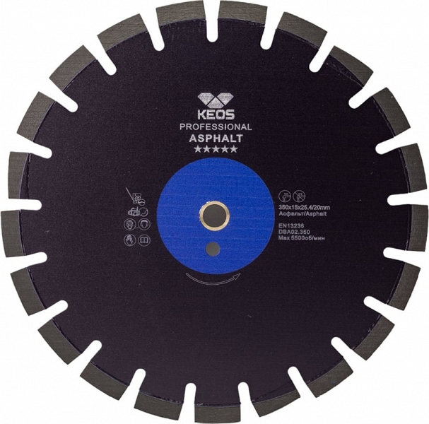 Диск алмазный сегментный по асфальту Keos Professional Asphalt 350 мм (Кеос Профессионал Асфальт 350 мм) предназначен для резки асфальта и асфальтобетона на бензиновых, дизельных и электрических резчиках и швонарезчиках мощностью до 8 кВт.