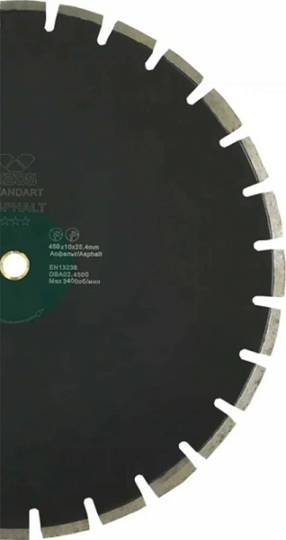 Диск алмазный сегментный по асфальту Keos Standart Asphalt 450 мм (Кеос Стандарт Асфальт 450 мм) предназначен для резки асфальта и асфальтобетона на бензиновых, дизельных и электрических резчиках и швонарезчиках мощностью до 10 кВт.