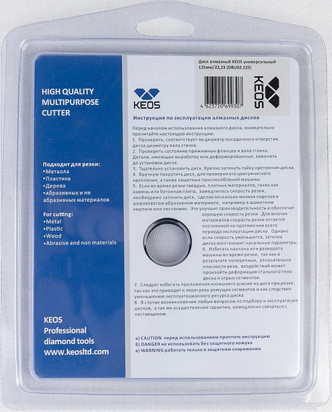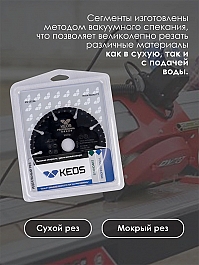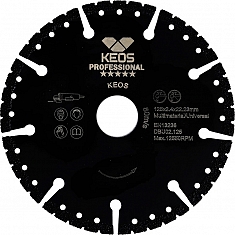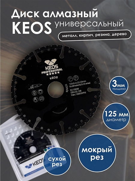 Диск алмазный универсальный Keos Professional 125 мм (Кеос Профессионал 125 мм) предназначен для резки металлов, пластика, резины, бетона, армированного бетона (железобетона), кирпича, древесины и т.д. ушм (болгарками), штроборезами, системами резки крупноформатной плитки, как с подачей воды, так и всухую. Подходит для универсального использования, аварийно-спасательных работ и многого другого.