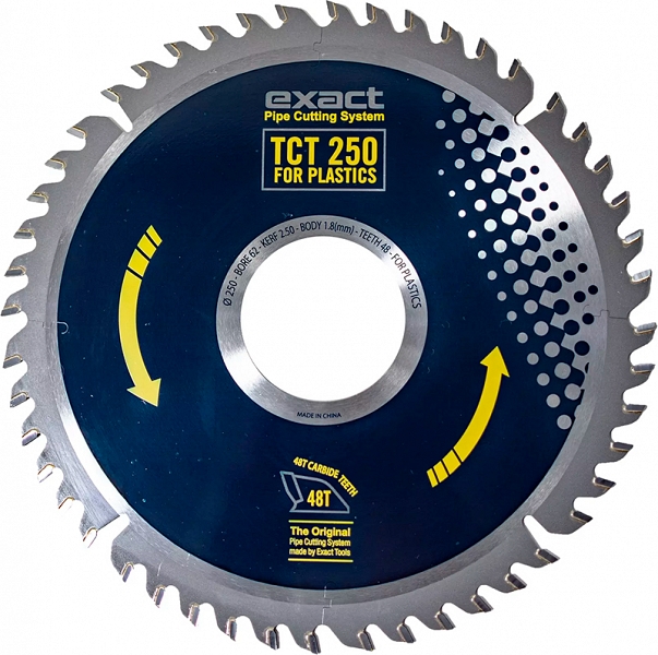Диск отрезной по пластику Exact TCT P250 (Экзакт ТЦТ П250) – пильный диск для резки пластиковых труб большого диаметра. Подходит для электрического трубореза Exact PipeCut P1000.