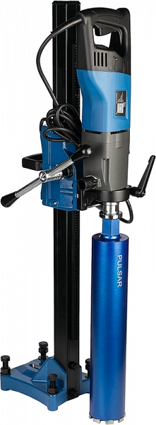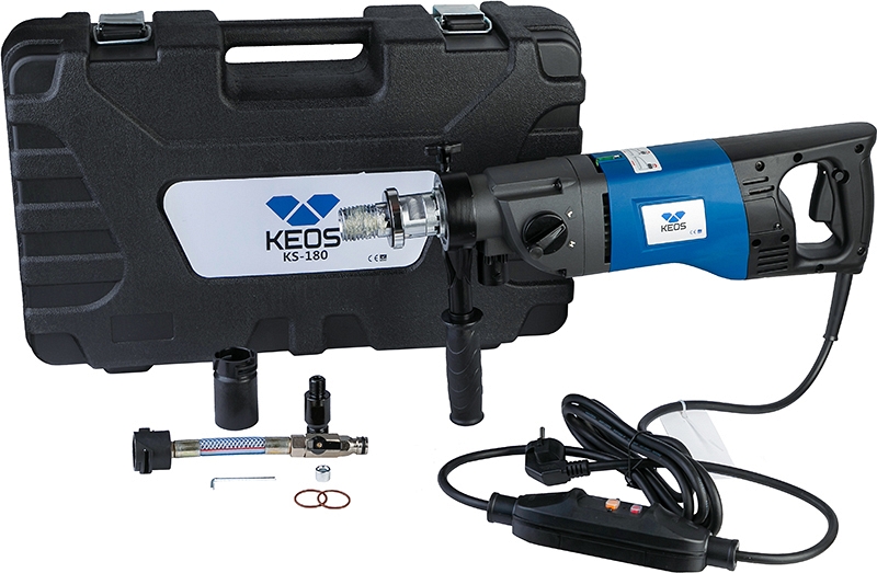 Дрель с микроударом для алмазного бурения Keos Pulsar KS-180 (Кеос Пульсар КС-180) – мотор с функцией микроудара для сухого алмазного сверления бетона, железобетона, кирпича, асфальта и других твердых материалов алмазными коронками Ø до 180 мм, может использоваться как в ручном режиме, так и с применением стойки (штатива).
