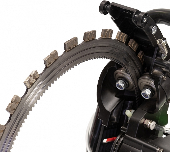 - Антипробуксовочная система: зубья режущего алмазного кольца входят в зацепление с ячейками приводного ролика – это исключает проскальзывание вала при повышенных нагрузках, например, при резке толстостенных труб или материалов с неравномерной структурой