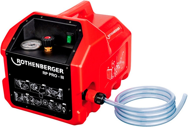 Самовсасывающий электрический проверочный гидравлический опрессовочный насос Rothenberger RP PRO-III (Ротенбергер РП ПРО-3) – опрессовщик электрический гидравлический для автоматической проверки давлением до 40 бар трубопроводов и резервуаров в системах водоснабжения, отопления, кондиционирования, пожаротушения, канализации, орошения, солнечных батарей и в других гидравлических и пневматических системах, а также при изготовлении сосудов высокого давления и промышленных котлов.