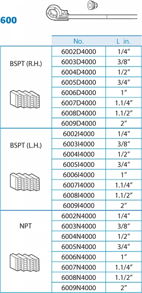 | 600010000 | Резьбонарезная трещотка | 1 1/2" – 2" | BSPT, NPT, Метрическая | R / L (Правая / Левая) |