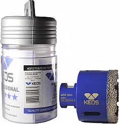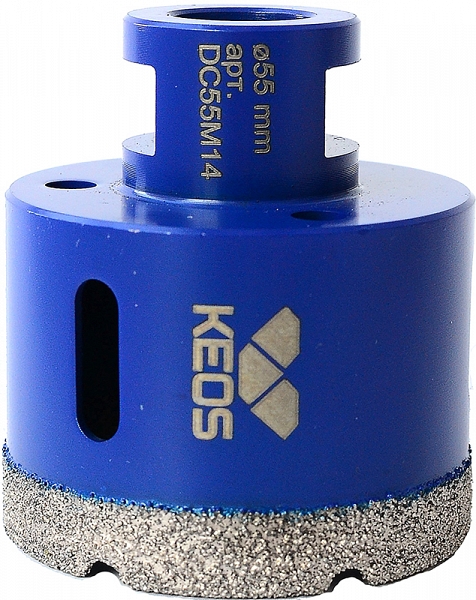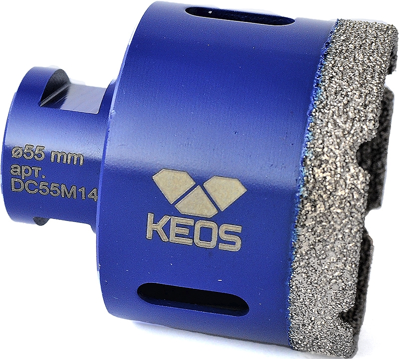 Коронка алмазная по керамограниту Keos Professional Vacuum Brazed M14 55 мм (Кеос Профессионал Вакуум Брейзед М14 55 мм) – корончатое сверло для сверления отверстий Ø 55 мм в керамической плитке, керамограните, граните, мраморе и других видах камня, как на сухую, так и с охлаждающими жидкостями, с использованием сетевых электрических и аккумуляторных УШМ.
