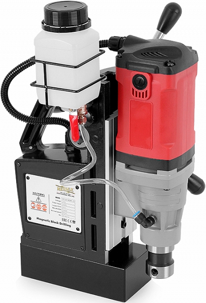 - Система подачи смазочно-охлаждающей жидкости (СОЖ) в зону сверления позволяет уверенно выполнять работу без перегрузки двигателя и перегрева корончатых сверл
