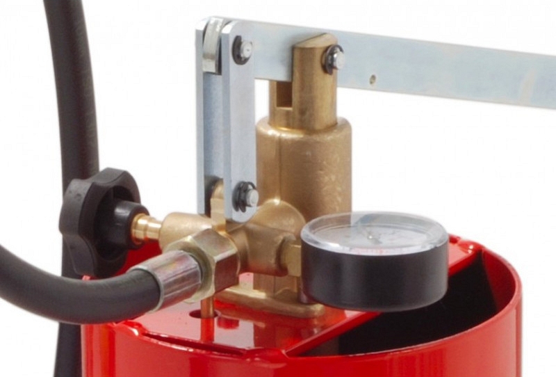 Опрессовщик ручной вертикальный MGF 60 бар (МГФ 60 бар) – ручной испытательный опрессовочный насос с вертикальным резервуаром и манометром для опрессовки и проверки герметичности контуров и сосудов под давлением, испытаний на утечку в водопроводах и резервуарах с давлением до 60 бар.