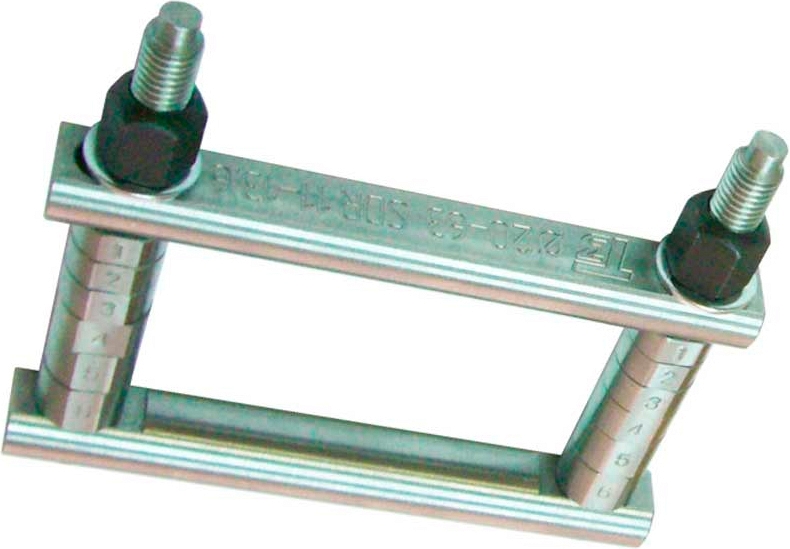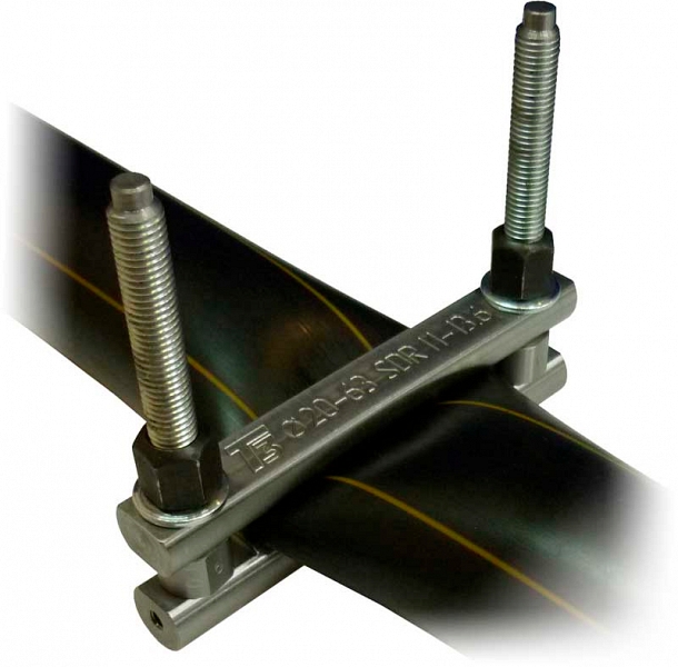 - Пережимное устройство со снятой верхней штангой имеет форму П-образной скобы, которая легко устанавливается на трубу даже в самом труднодоступном месте. После установки верхней штанги затягивают две гайки любым ключом 19 мм. Движение верхней штанги отграничено двумя сменными маркированными ограничителями на шпильках. Правильный выбор ограничителей (см. таблицу на деревянной коробке) гарантирует герметичное перекрытие пластиковой трубы при отсутствии необратимых повреждений ее стенок.
