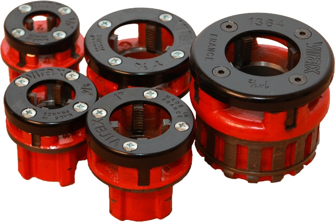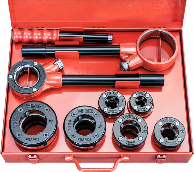 Ручной резьбонарезной клупп Virax 1/2"-3/4"-1"-1 1/4"-1 1/2"-2" BSPT Правая (Виракс 1/2"-3/4"-1"-1 1/4"-1 1/2"-2" БСПТ Правая) – профессиональный высокопроизводительный ручной резьбонарезной набор клуппов для нарезки правой конической трубной резьбы BSPT на стальных трубах Ø 1/2", 3/4", 1", 1 1/4", 1 1/2", 2".