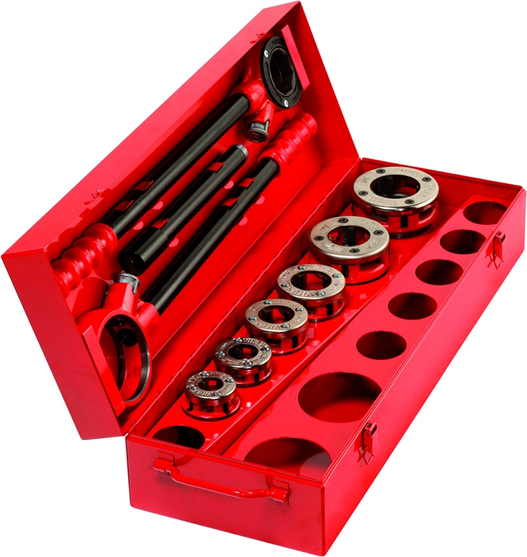 Ручной резьбонарезной клупп Virax 1/2"-3/4"-1"-1 1/4"-1 1/2"-2" NPT Правая (Виракс 1/2"-3/4"-1"-1 1/4"-1 1/2"-2" НПТ Правая) – профессиональный высокопроизводительный ручной резьбонарезной набор клуппов для нарезки правой конической трубной резьбы NPT на стальных трубах Ø 1/2", 3/4", 1", 1 1/4", 1 1/2", 2".
