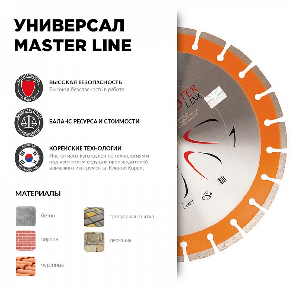 Сегментный алмазный круг Diam Master Line 1A1RSS Универсал 125 мм (Диам Мастер Лайн 1А1РСС Универсал 125 мм) – специальный алмазный отрезной диск с лазерной сваркой сегментов для сухой и мокрой резки бетона, тротуарной плитки, кирпича, черепицы, песчаника, природного и искусственного камня, строительных материалов общего назначения на углошлифовальных машинах (ушм, болгарках), штроборезах, системах резки крупноформатной плитки, с подачей и без подачи воды.