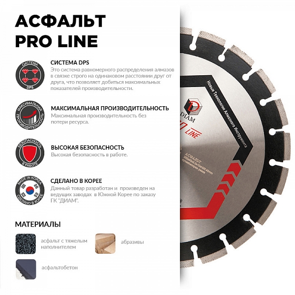 Сегментный алмазный круг Diam Pro Line 1A1RSS Асфальт 300 мм (Диам Про Лайн 1А1РСС Асфальт 300 мм) – профессиональный алмазный отрезной диск с лазерной сваркой сегментов, произведенный по технологии DPS (позиционирования алмазов в режущем слое), для сухой и мокрой резки асфальта с тяжелым наполнителем, асфальтобетона, абразивного песчаника, кирпича и других абразивов на резчиках швов, стенорезных машинах, бензорезах, электрических резчиках и плиткорезах, камнерезных станках и другом оборудовании, как с водяных охлаждением, так и без него.