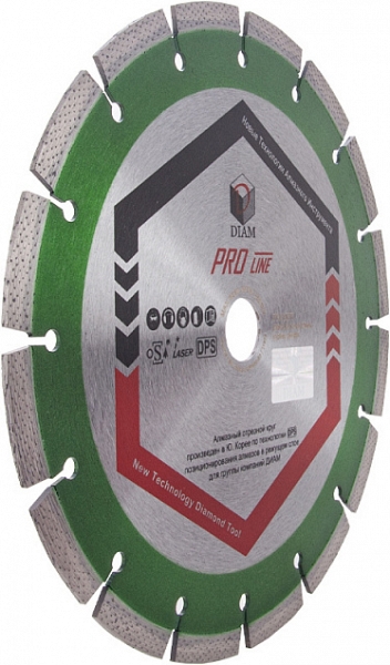 Сегментный алмазный круг Diam Pro Line 1A1RSS Laser Гранит 230 мм (Диам Про Лайн 1А1РСС Лазер Гранит 230 мм) – профессиональный алмазный отрезной диск, произведенный по технологии DPS – позиционирования алмазов в режущем слое, для сухой и мокрой резки гранита, кварца, твердых песчаников на ручном электроинструменте (углошлифовальных машинах, ушм, болгарках, штроборезах, системах резки крупноформатной плитки, бензорезах, электрических резчиках, ручных стенорезных машинах) и плиткорезах электрических, как с подачей охлаждающей жидкости, так и без.