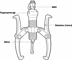 - Съемник гидравлический состоит из корпуса гидроцилиндра, упорного штока, захватов (лап) и быстроразъемного соединения (БРС). Внешний насос подключается к съемнику с помощью рукава высокого давления через БРС. Подача рабочей жидкости в полость гидроцилиндра съемника под давлением происходит за счет приведения в работу внешнего гидравлического насоса.