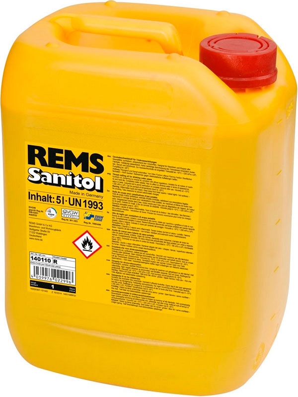 Синтетическая смазка для нарезания резьбы Rems Sanitol 5 л (Ремс Санитоль 5 л) без минеральных масел специально разработана для трубопроводов питьевой воды, великолепно подходит для нарезки обычной резьбы, а также в качестве смазывающе-охлаждающей жидкости при пилении металлов и универсального использования.