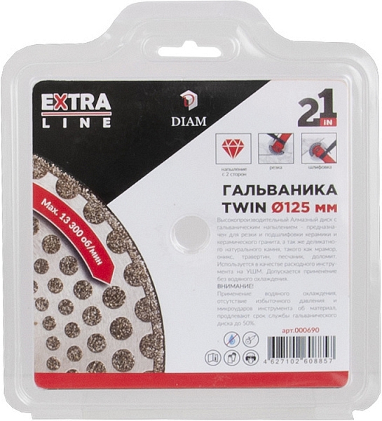 Специальный алмазный круг Diam Extra Line Turbo Гальваника Twin 125 мм (Диам Экстра Лайн Турбо Гальваника Твин 125 мм) – высокопроизводительный гальванический алмазный диск с гальваническим напылением для резки и подшлифовки керамики, керамической плитки, керамогранита, керамического камня, гранита, мрамора, оникса, травертина, песчаника, доломита на угловых шлифовальных машинах (ушм, болгарках), штроборезах, системах резки крупноформатной плитки.