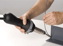 – Сварка прутком из жестких термопластов: ПНД, ПП, Н-ПВХ (винипласт), АБС, ПВДФ и прочих. Применяется для ручной сварки листов, сварки ПВХ покрытий для промышленных полов, профилей и прочих конструкционных деталей. Необходимые принадлежности: круглое сопло 5 мм (артикул F4000) или резьбовой адаптер (артикул F4007), сопла быстрой сварки для круглого прутка (артикул F5010, F5011, F5012 или F5005, F5006, F5007), сопла быстрой сварки для треугольного прутка (артикул F5013, F5000, F5001, F5014 или F5008, F5002, F5003, F5009), нож-полумесяц (артикул F7010)