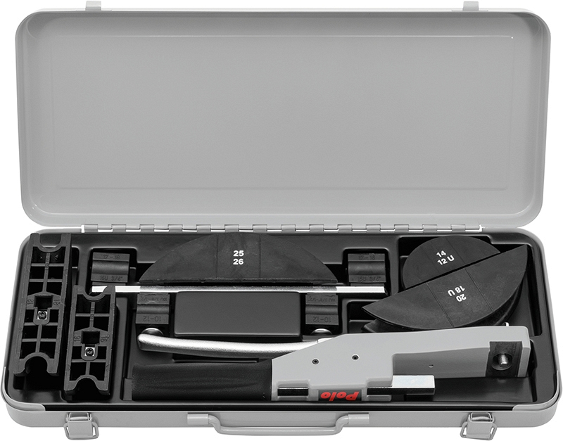 Трубогиб арбалетный ручной Roller Polo Set 14-16-18-20-25/26 мм (Роллер Поло Сет 14-16-18-20-25/26 мм) – практичный, очень удобный, сверхлегкий трубогиб для работы одной рукой для легкой, простой и точной гибки мягких медных труб Ø 10 – 22 мм, 3/8" – 7/8", толщиной стенки до 1 мм; медных труб с мягкой оболочкой Ø 10 – 18 мм, 3/8" – 5/8", толщиной стенки до 1 мм; труб из углеродистой стали с мягким покрытием систем пресс-фитинга Ø 12 – 18 мм, толщиной стенки до 1,2 мм; труб из мягкой прецизионной стали Ø 10 – 18 мм, толщиной стенки до 1 мм; многослойных композитных труб Ø 14 – 32 мм; на угол до 90° при изготовлении колен и отводов на стройплощадках и в местах с ограниченным доступом.