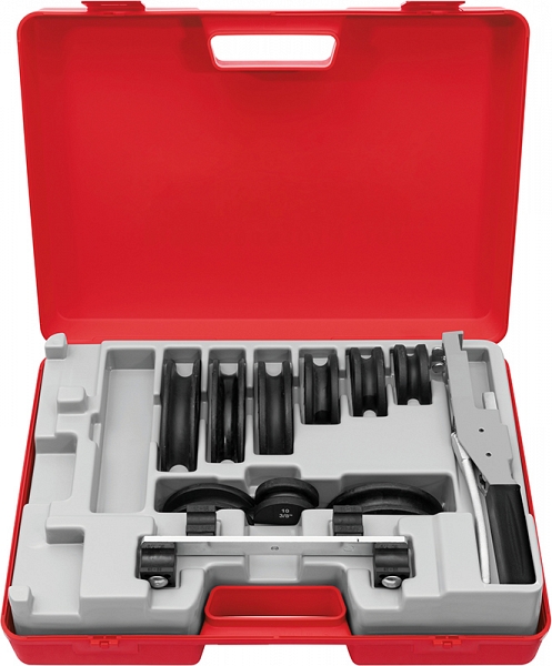 Трубогиб арбалетный ручной Roller Polo Set Allround 22 10-12-14-15-16-17-18-20-22 мм (Роллер Поло Сет Оллраунд 22 10-12-14-15-16-17-18-20-22 мм) – практичный, очень удобный, сверхлегкий трубогиб для работы одной рукой для легкой, простой и точной гибки мягких медных труб Ø 10 – 22 мм, 3/8" – 7/8", толщиной стенки до 1 мм; медных труб с мягкой оболочкой Ø 10 – 18 мм, 3/8" – 5/8", толщиной стенки до 1 мм; труб из углеродистой стали с мягким покрытием систем пресс-фитинга Ø 12 – 18 мм, толщиной стенки до 1,2 мм; труб из мягкой прецизионной стали Ø 10 – 18 мм, толщиной стенки до 1 мм; многослойных композитных труб Ø 14 – 32 мм; на угол до 90° при изготовлении колен и отводов на стройплощадках и в местах с ограниченным доступом.