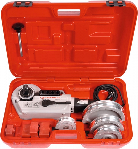 Трубогиб электрический Rothenberger Robend 4000 Set 12-15-18-22 мм (Ротенбергер Робенд 4000 Сет 12-15-18-22 мм) – мощный, надежный, переносной, электромеханический трубогиб с повышенной производительностью для холодной гибки под углом до 180° труб из твердой, полутвердой и мягкой меди (DIN EN 1057) Ø 12 – 35 мм; медных труб в оболочке, прецизионных мягких стальных труб (DIN 2391 / 2393 / 2394) Ø 12 – 35 мм; черных и оцинкованных стальных труб (DIN 2440 / 2441) Ø 3/8" – 1 3/8"; бесшовных стальных труб (GW 541), металлопластиковых (МПТ) труб Ø 12 – 35 мм (1/2" – 1 3/8"), толщиной стенки до 3,25 мм. Универсальное использование при монтаже систем водоснабжения, отопления, холодильной и климатической техники, прокладке трубопроводов, в промышленности, для серийного производства. Производитель: ROTHENBERGER (РОТЕНБЕРГЕР) – Германия.