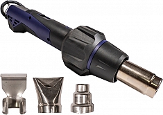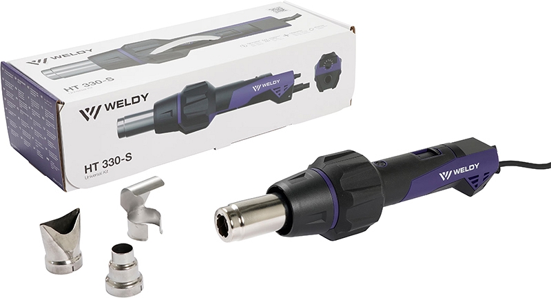 Универсальный строительный термофен Weldy HT 330-S (Велди ХТ 330-С) – мощный сварочный паяльный технический фен (набор) для нагрева, пайки, обтяжки пленкой (автовинилом), ремонта бамперов, активации / термоактивации термоадгезивов и клея (приклеивания кромок, обработки изделий из кожи), разъединения заевших крепежных узлов, закалки, размораживания, сушки, глянцевания, отверждения, термоусадки трубок, муфт, уплотнителей, соединителей под пайку (при работе с электропроводкой и электрическими щитками), термоусадки пленок, упаковки небольших объектов (например, капсулирования, герметизации и усадки упаковки аккумуляторных элементов), формования / формовки (например, при изготовлении ортопедических изделий, протезов), декорирования, создания макетов, удаления защитных и декоративных покрытий с различных поверхностей, удаления остатков волокон и многого другого. Идеально подходит для укладки эластичных напольных покрытий из ПВХ (винила) и натуральных материалов, таких, как: линолеум и резина; для промышленного применения с использованием горячего воздуха в помещениях, например, в транспортной промышленности, упаковочной отрасли, производстве электроники и т.д. (для различных работ в помещениях).