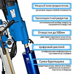 Установка для алмазного бурения Keos KS-500 JSet (Кеос КС-500 ДжейСет) предназначена для сверления отверстий Ø 50 – 500 мм с 2-мя пластинами 50 мм в бетоне, железобетоне, кирпиче и других твердых материалах, под прямым углом и под углом 90° – 0°. Идеально подходит для прокладки телекоммуникационных и сантехнических сетей, сверления отверстий на строительных объектах.