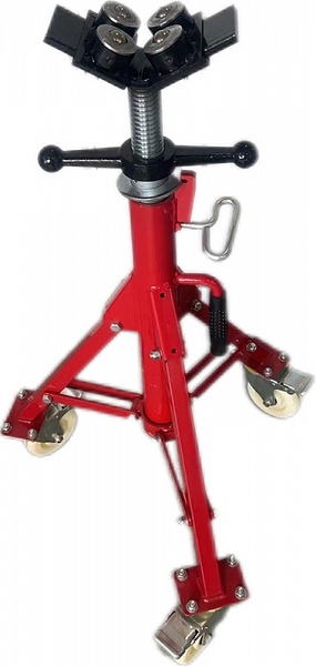 V-образная 4-х роликовая складная регулируемая трубная опора на колесах Rotorica 1/2-12 (Роторика 1/2-12) предназначена для работы с трубами Ø 20 – 325 мм (1/2" – 12"). Широко используется при сварке тяжелых, фасонных, твердых и круглых труб; для поддержки труб во время накатывания желобков, нарезания резьбы, резки, снятия фаски, вырезания отверстий и т.д.