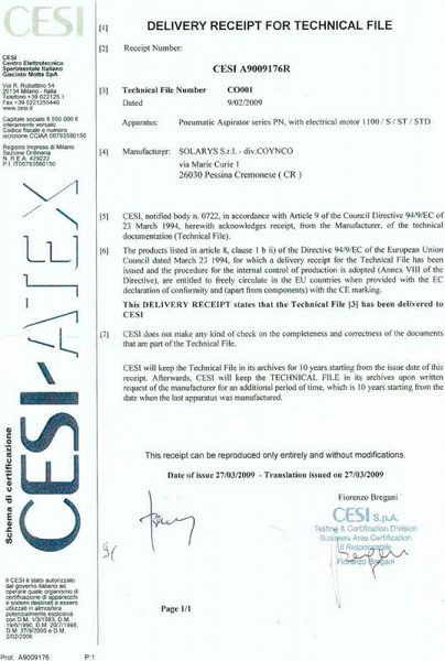 Пылесосы Coynco имеют взрывобезопасное (взрывозащищенное) исполнение, соответствуют европейским требованиям ATEX (ATmosphere EXplosive) и требования взрывобезопасности по ТР ТС 012/2011 "О безопасности оборудования для работы во взрывоопасных средах". Благодаря использованию техники данного типа снижается степень риска самовозгорания производственных отходов и взрывоопасность окружающей атмосферы.